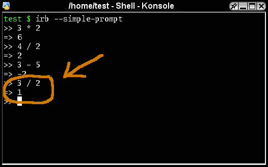 Ein Integer ist eine ganze Zahl, wie 1, 2, -5, usw. Wenn Sie nur Integerwerte benutzen, wird Ruby Ihnen auch ein Integer zurückliefern.