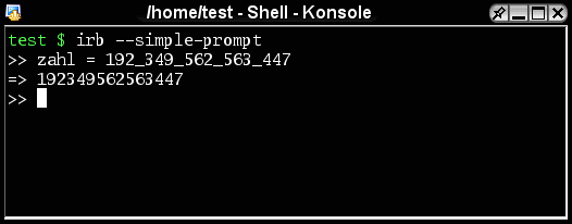 Ruby ist gut in der Handhabung von sehr großen und sehr kleinen Zahlen. Stellen Sie sich vor, sie möchten die Zahl 192349562563447 haben.