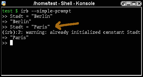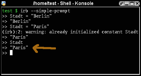| Anmerkung: Obwohl Stadt eine "Konstante" ist, wurde der Wert trotzdem geändert. Ruby wird Sie nur warnen, wenn Sie den Wert einer Konstante ändern. Siehe unten. |