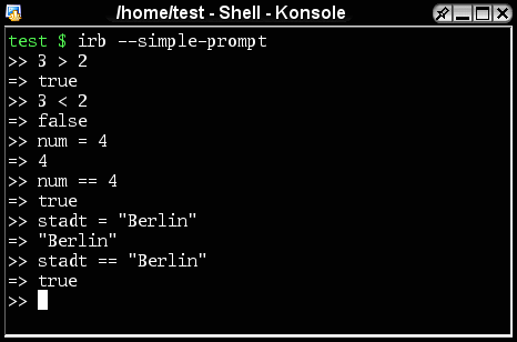 Ruby hat eine Notation für true und false. Dies wird am besten durch Beispiele aufgezeigt. Starten Sie irb und geben Sie das Folgende ein: