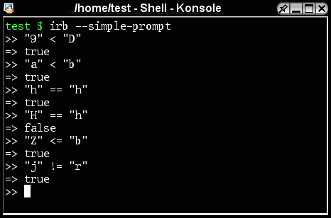 Wie verhalten sich diese Operatoren bei Strings? Nun, == prüft Zeichenketten auf Gleichheit und > und ähnliche werden bestimmt nach der Reihenfolge in der ASCII-Tabelle.