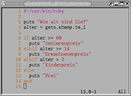 Um die Sachen besser klarzustellen, geben wir dies in ein Programm ein. Das Programm fragt nach dem Alter und gibt den entsprechenden Fahrpreis aus.