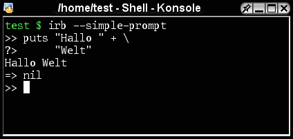 Sie können Zeilenumbrüche mit einem - \ - am Ende der Zeile erreichen. Schauen Sie sich ein Beispiel in irb an.
