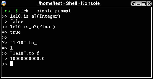 Wenn Sie die Methode String#to_i benutzt haben, besteht die Chance, dass "1e10" in 1 konvertiert wurde. Versuchen wir dies in irb raus zu finden.