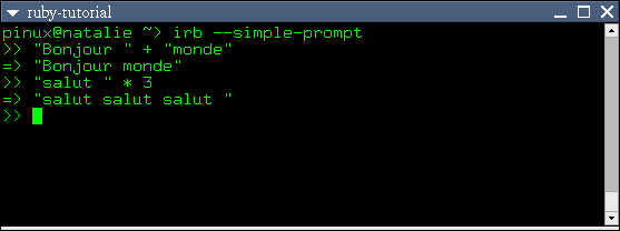 Ruby identifie ce genre de données par le terme chaine de caractères (en anglais, «string»). Voici quelques exemples de chaînes: