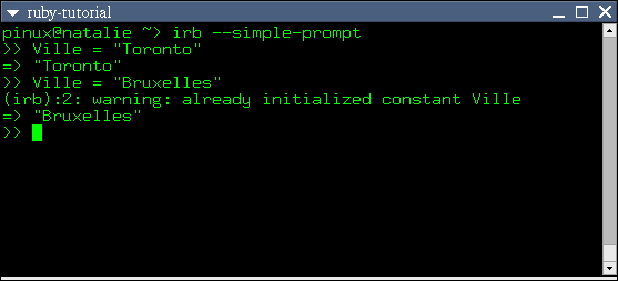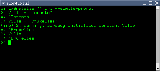 Même si Ville est une constante, sa valeur change quand même. Définir une constante signifie seulement que Ruby vous avertira si vous modifiez sa valeur. Regardez: ![]()
