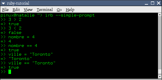 Dans Ruby, il est possible d'effectuer plusieurs actions en fonction d'une série de conditions, en utilisant le mot magique if. Voici un exemple: