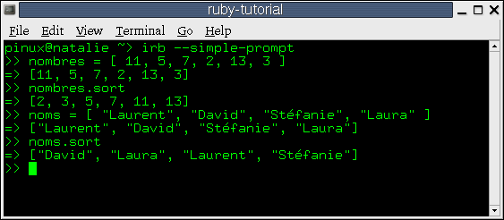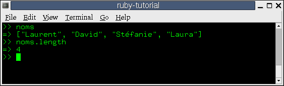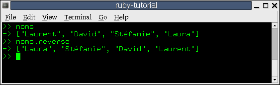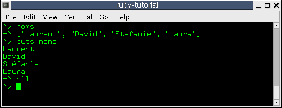 Finalement, nous pouvons bien sûr afficher le contenu d'un tableau à l'écran, en utilisant l'instruction puts: