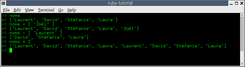 Les méthodes Array#+, Array#- et Array#* se comportent logiquement:
