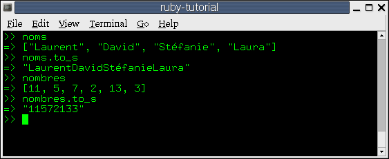 Notez également qu'il est possible de convertir un tableau en une chaîne de caractères, en invoquant la méthode Array#to_s: