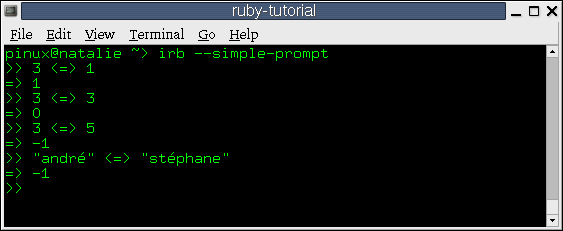 Trier étant une opération fort courante, il existe donc un opérateur spécialement dédié à ça. L'opérateur <=> retourne pour nous les fameuses valeurs -1, 0 et 1. Essayez ceci dans IRB: