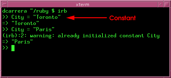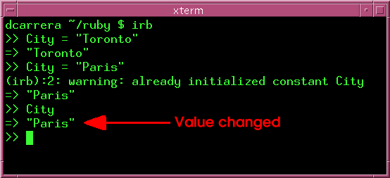 | Note: Though City is a "constant", its value still changed. Being a constant only means that Ruby will warn you if you change its value. See below. |